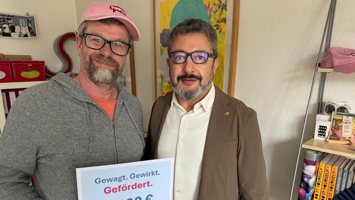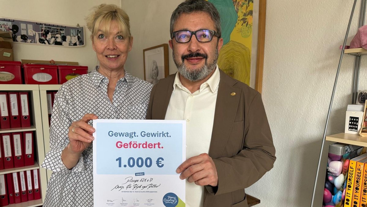 Über eine Zuwendung in Höhe von 1.000€ freuen sich Silke Hartmann und Jakob Hoffmann als Vertreter des Vereins "Raum 121". Adem Saracoglu überreichte als Botschafter der Stiftung die Zuwendung in den Räumen des Vereins am 13.04.2026.